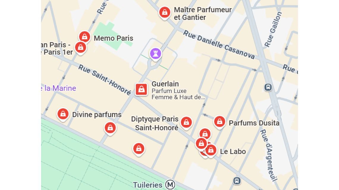Within walking distance you can find Marc-Antoine Barrois, on Rue du Faubourg Saint Honoré, Maître Parfumeur et Gantier on Rue Danielle Casanova, Nicolai on Rue de Richelieu and Heeley in the Galerie de Montpensier.
